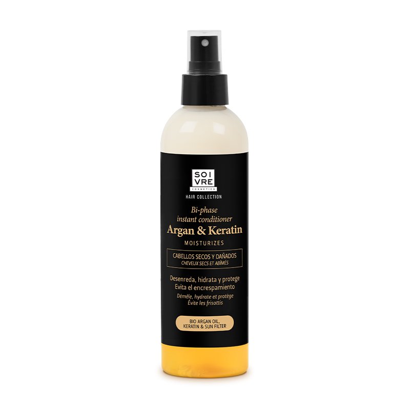 Formulé à base d'une combinaison exclusive d'huile d'argan BIO et de kératine, il apporte aux cheveux une teneur élevée en vitamine E et en acides gras essentiels, qui assurent nutrition, réparation et brillance spectaculaire. Grâce à l'action puissante de l'après-shampoing biphasique, il laisse les cheveux doux et soyeux et facilite le coiffage, éliminant instantanément les enchevêtrements. Il contient également une crème solaire pour protéger les cheveux du soleil. Indiqué à appliquer pendant l'exposition au soleil, car il vous garde protégé et hydraté. Les cheveux retrouvent leur vitalité et conservent leur couleur.